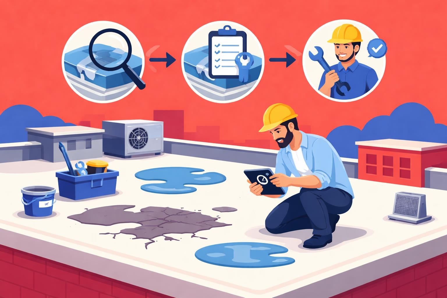 Expert guide to commercial flat roof repair covering inspections, common issues, repair methods, and maintenance for business property owners.